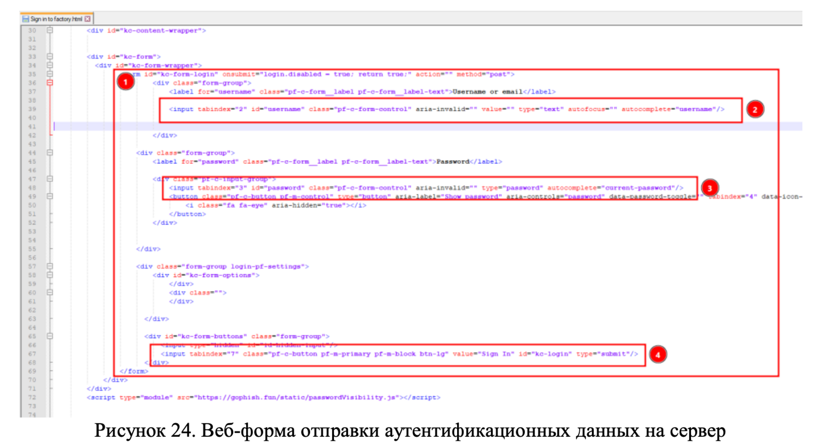 В очередной раз возвращаемся к HTML-версии фишингово сайта и находим форму отправки данных на сервер (Рисунок 24).