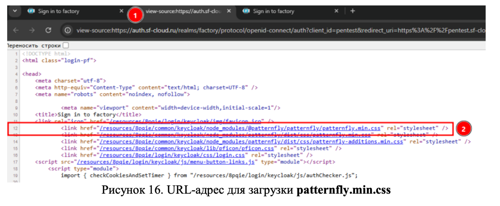 Все также через исходный код страницы оригинала определяем URL-адрес к файлу patternfly.min.css – https://auth.sf-cloud.ru/resources/8pqie/common/keycloak/node_modules/@patternfly/patternfly/patternfly.min.css (Рисунок 16).