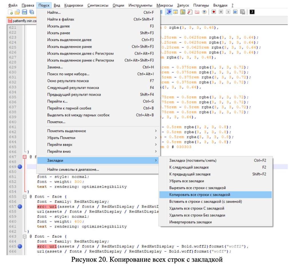 Далее выделенные строки копируем в отдельное окно – Поиск, Закладки, Копировать все строки с закладкой (Рисунок 20).