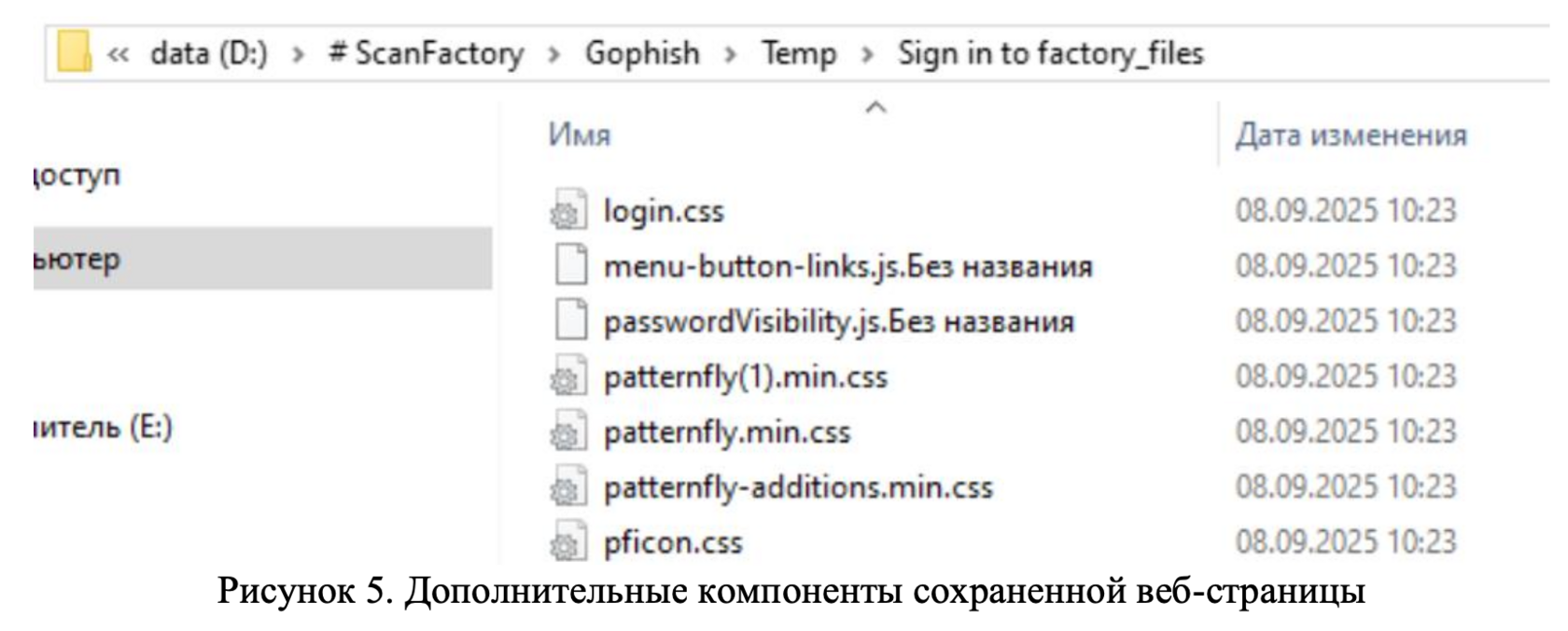 Начнем, пожалуй, с сохранения исходного кода страницы и всех статических элементов в локальную директорию. Для этого правой кнопкой мыши, сохранить как, веб-страница полностью и указываем путь. Переходим к загрузкам (Рисунок 4). Нам доступен код HTML-страницы и ряд дополнительных компонент (CSS и несколько JS-файлов). Сразу можно обратить внимание, что в каталоге присутствуют файлы с одинаковым именем (patternfly.min.css) и неверно заданы расширения для JS-файлов (Рисунок 5).