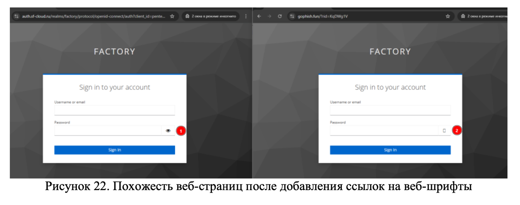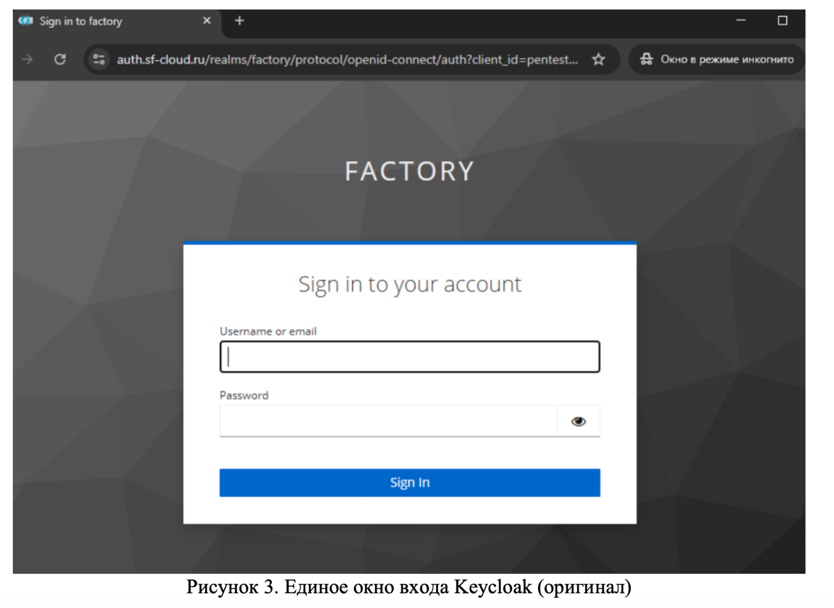 В качестве оригинала возьмем логинку пентестерского личного кабинета ScanFactory – https://pentest.sf-cloud.ru/. При попытке доступа попадаем на единое окно входа Keycloak, где как раз предлагается ввести логин и пароль (Рисунок 3).