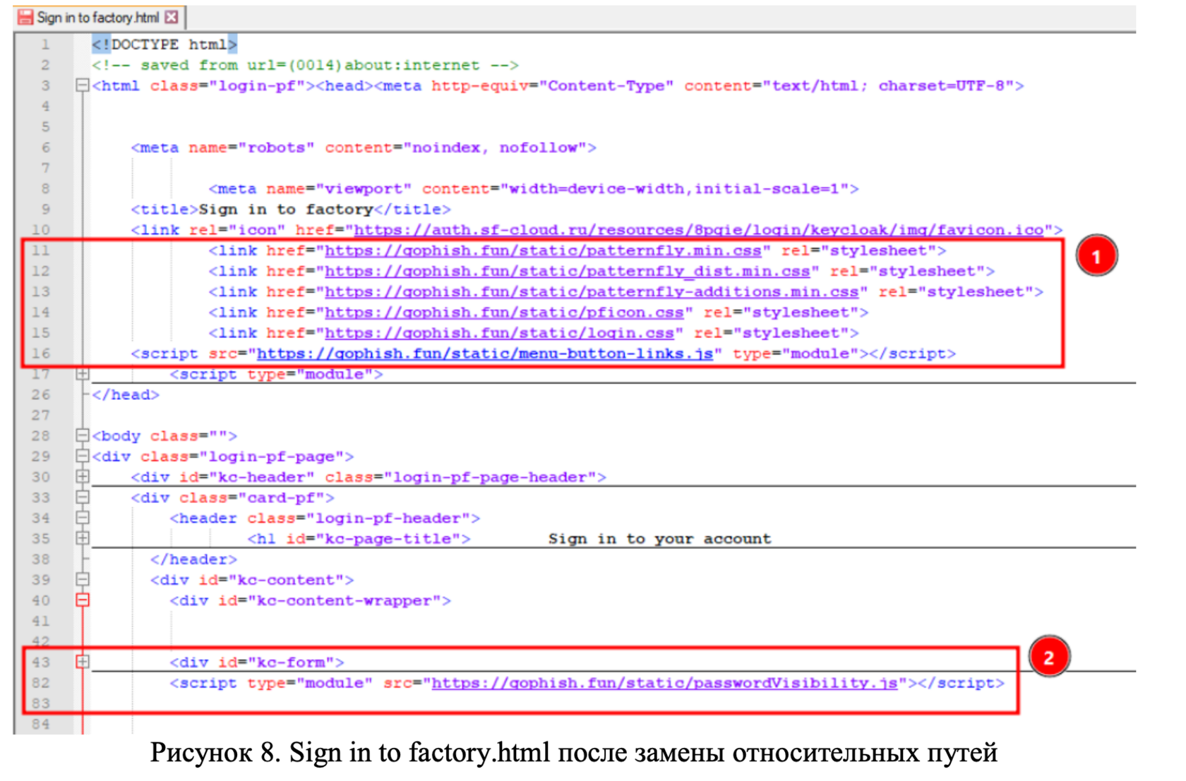 Теперь в файле Sign into factory.html произведем замену всех относительных путей на соответствующие URL-адреса (Рисунок 8). Для чистоты эксперимента давайте также поступим со строкой 10. Сохраним иконку favicon.ico локально и изменим атрибут HREF тега LINK на https://gophsih.fun/static/favicon.ico.