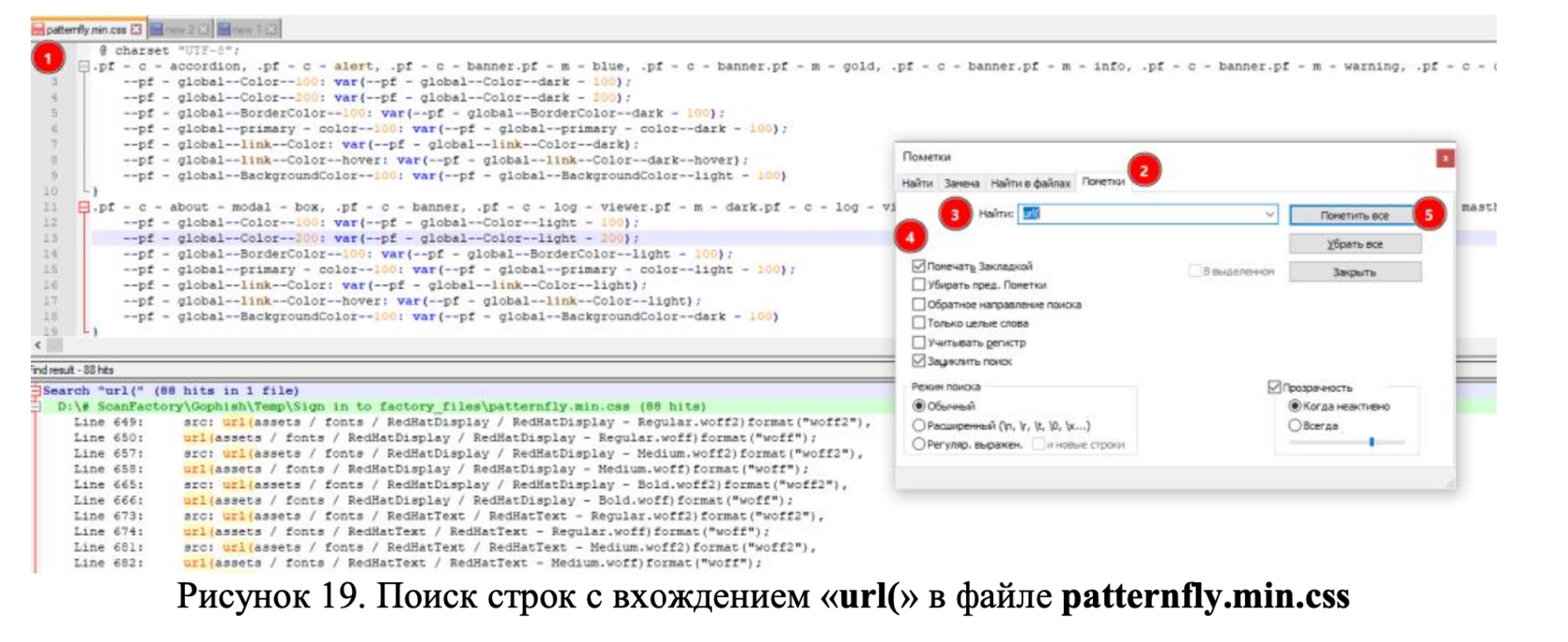 Теперь найдем все строки с вхождением «url(» и пометим их закладкой (Рисунок 19). Таких оказалось 88, но не все из них подгружают локальные компоненты.