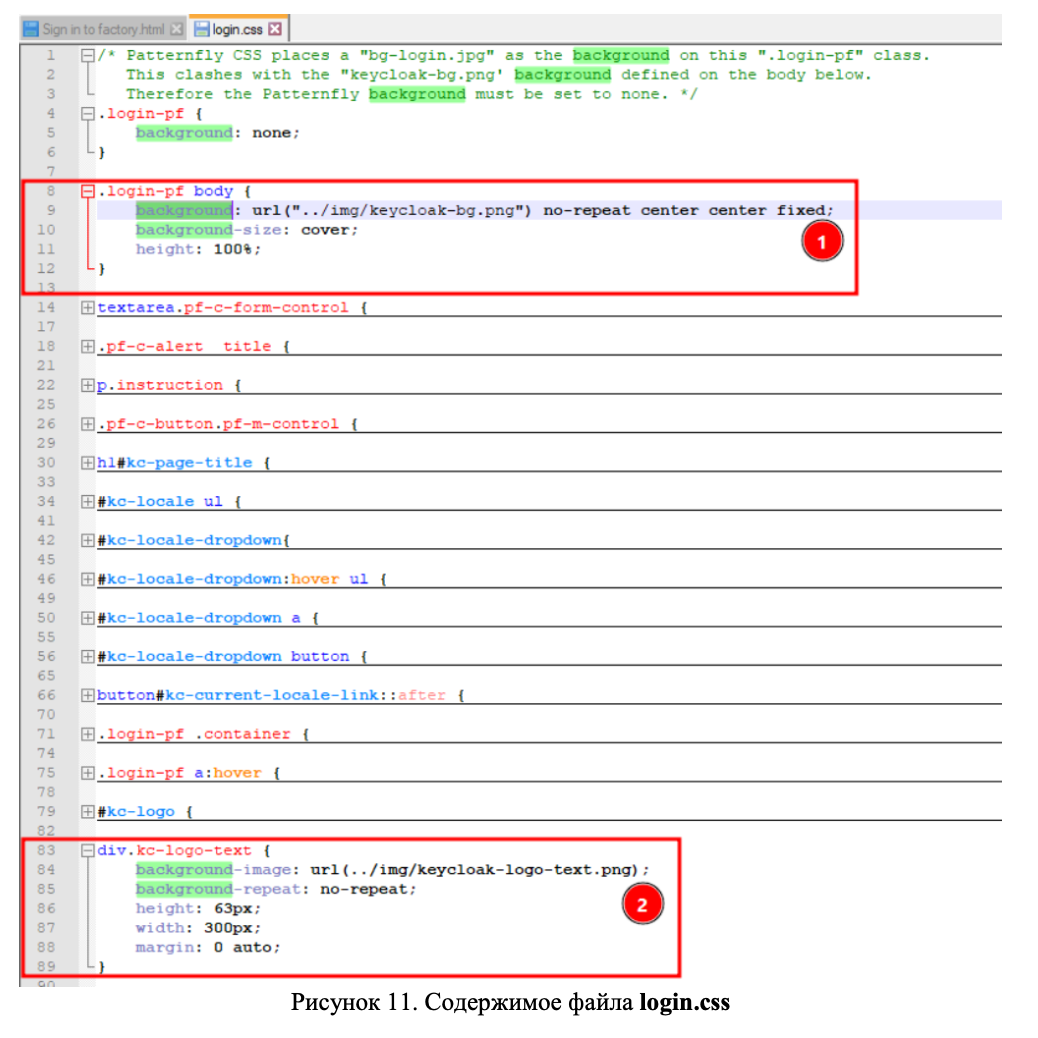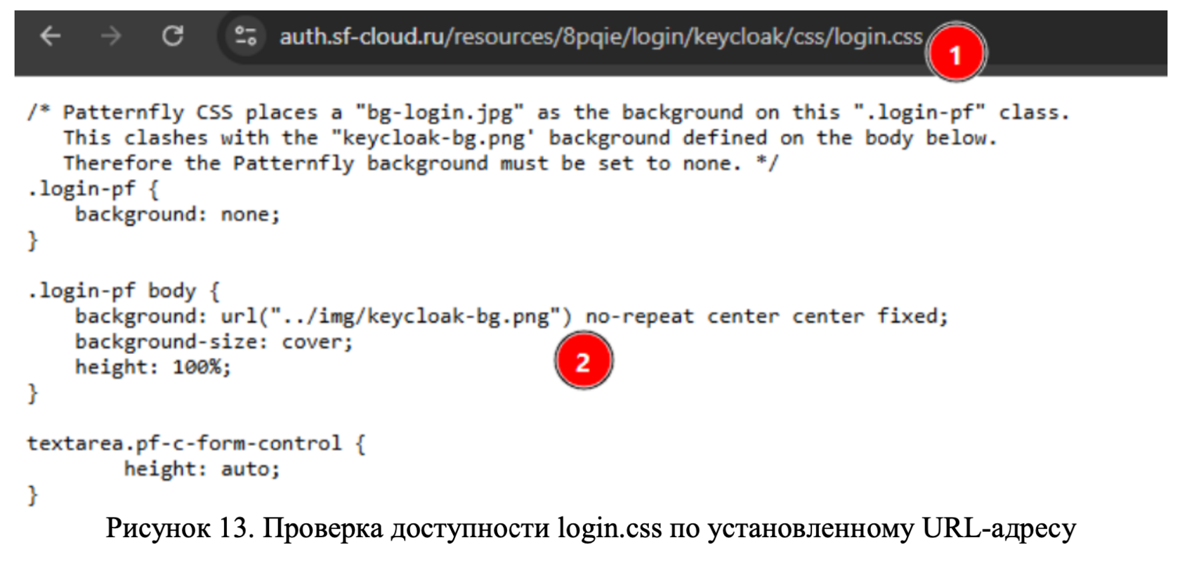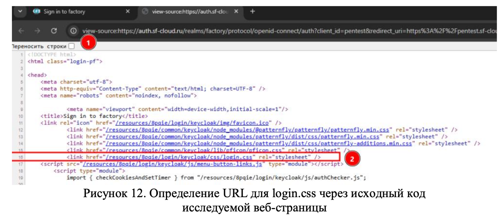 Что здесь происходит? В момент отображения веб-страницы идет попытка загрузки фонового изображения keycloak-bg.png из директории ../img относительно расположения файла login.css. Таким образом, необходимо определить URL для login.css и уже относительно него сместиться к каталогу с фоновым изображением. Идем к оригиналу веб-страницы и смотрим откуда загружается login.css (Рисунок 12).