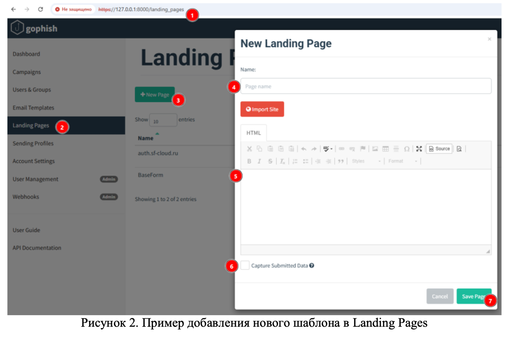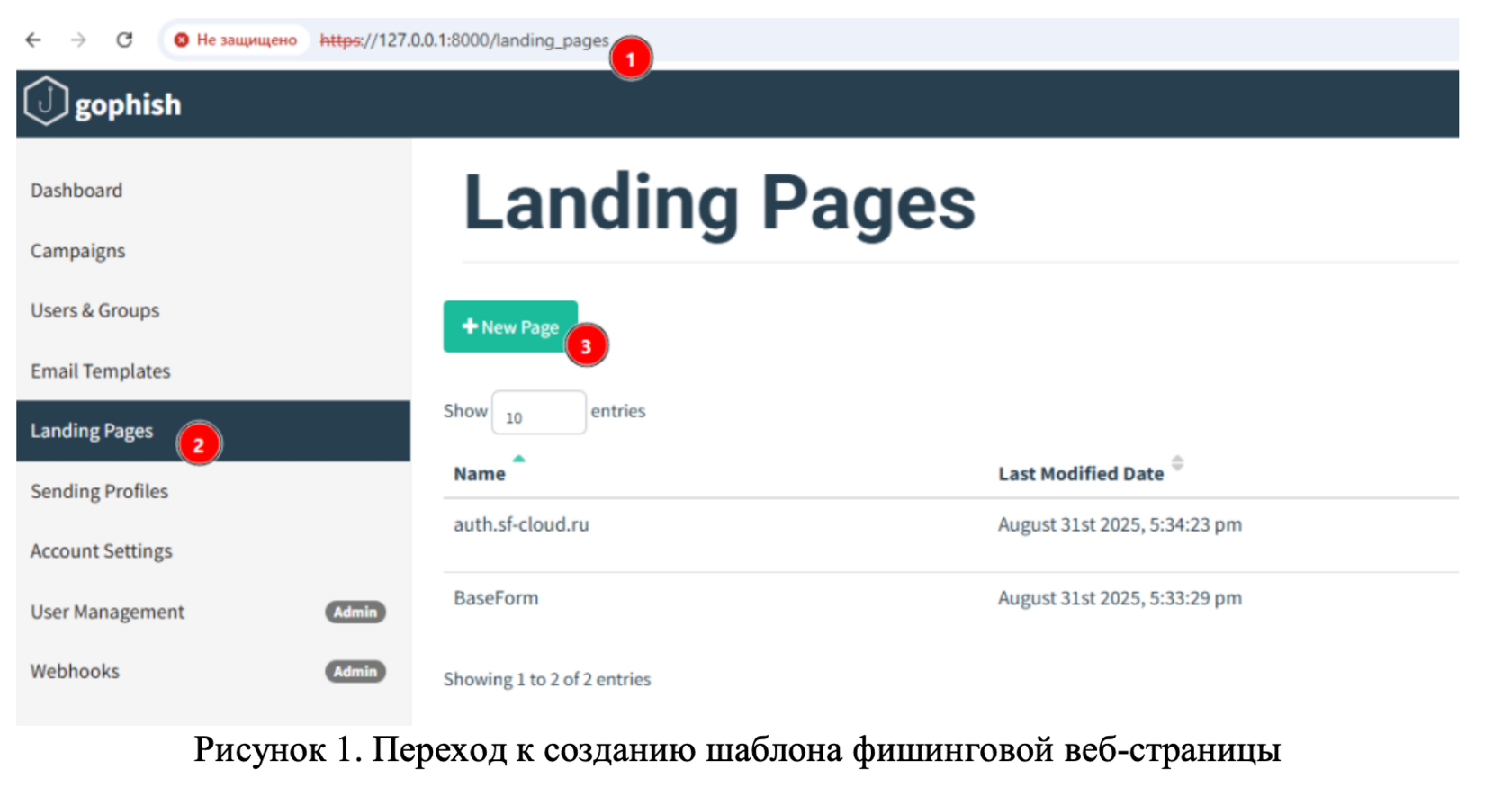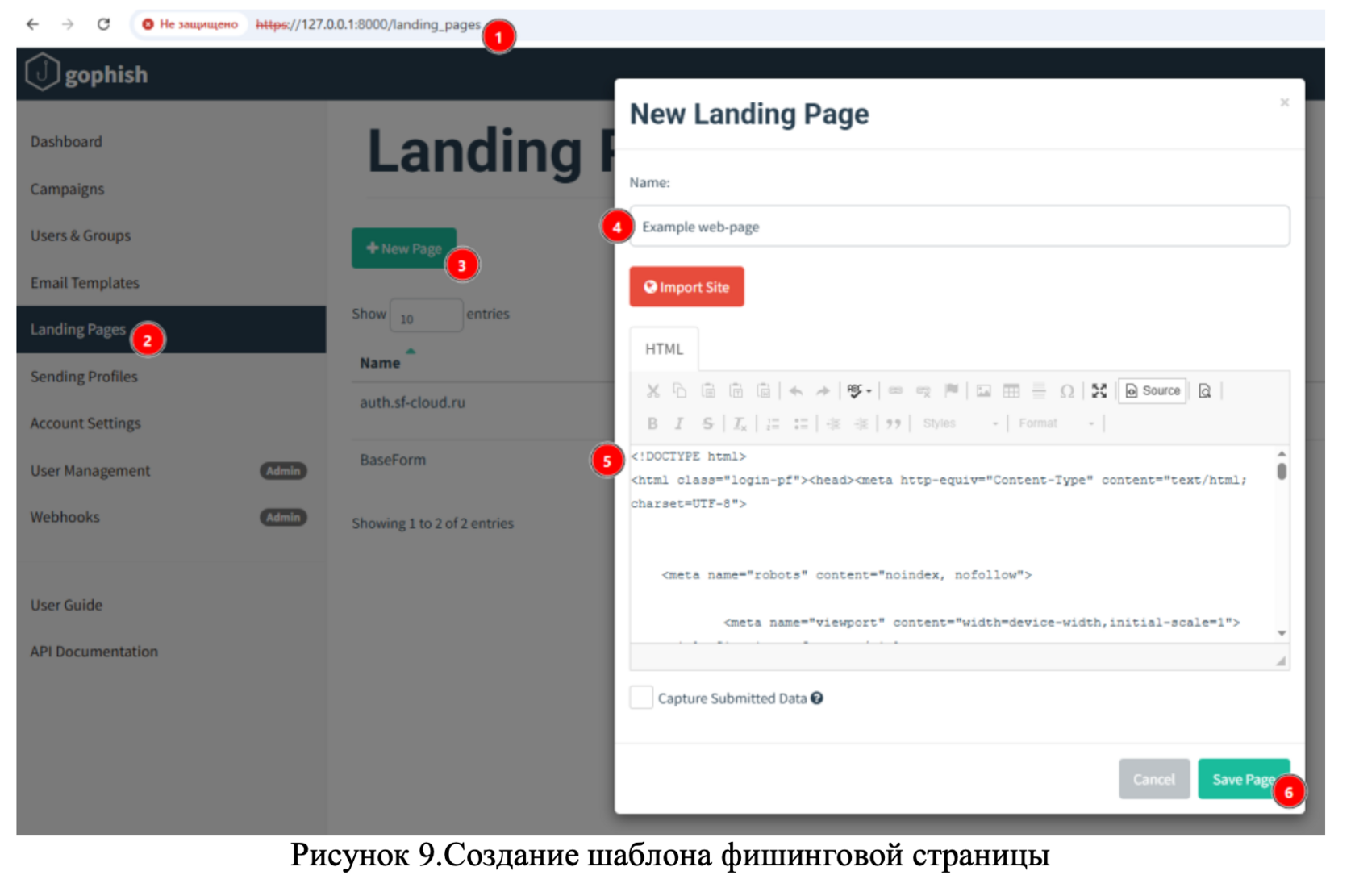 Для создания фишинговой страницы в GoPhish предусмотрен раздел Landing Pages (Рисунок 1).