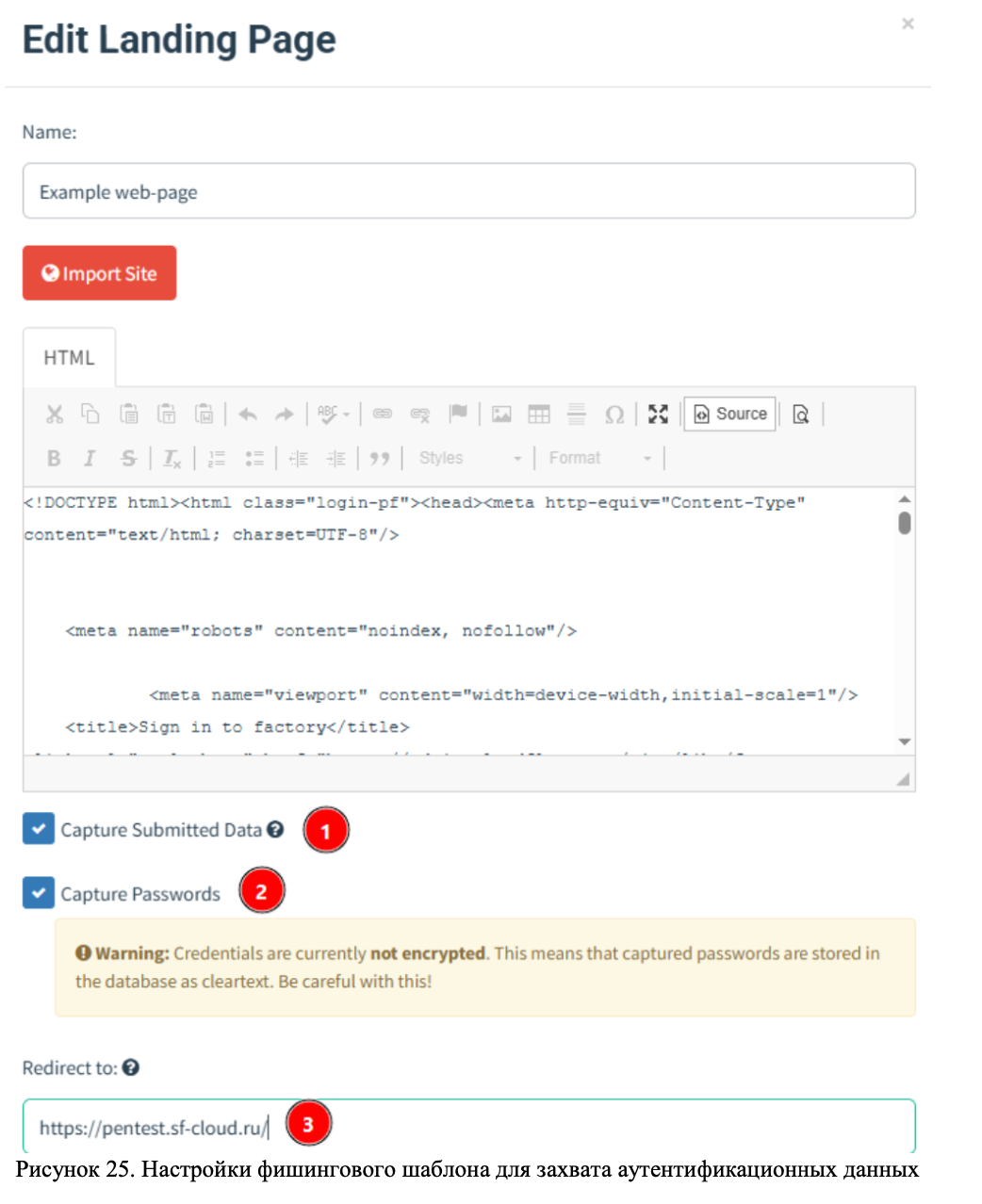 Переходим к административной панели GoPhish и создаем новый шаблон на вкладке Landing Pages. Содержимое модифицированного файла Sign in to factory.html вставляем в область HTML и сохраняем (Рисунок 9).