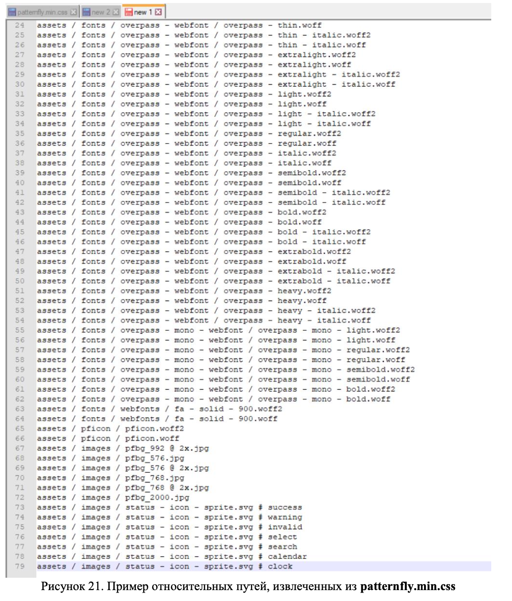Что по печатным символам? В файле patternfly.min.css обнаружено некоторое количество ссылок на загрузку внешних шрифтов (Рисунок 15). Будем так любезны их все загрузить в уже хорошо знакомый каталог /home/gophish/gophish/static/endpoint и заменить относительные пути на соответствующие URL-адреса.