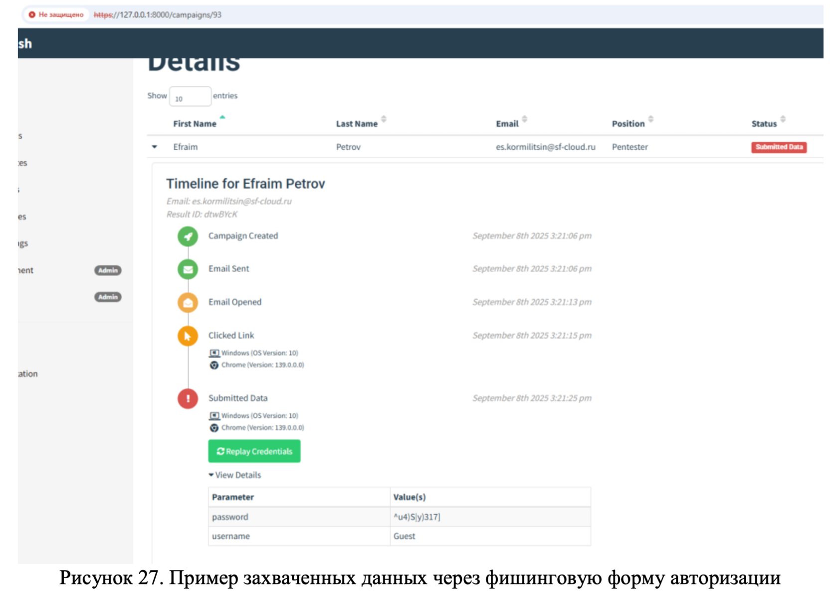 Создаем новую кампанию, переходим по ссылке и проверяем наличие перехваченного пароля (Рисунок 26, 27)!